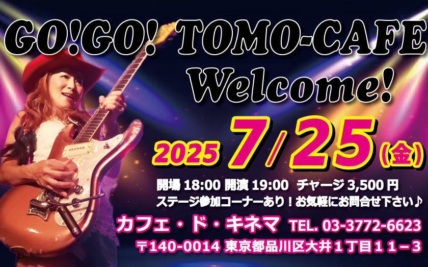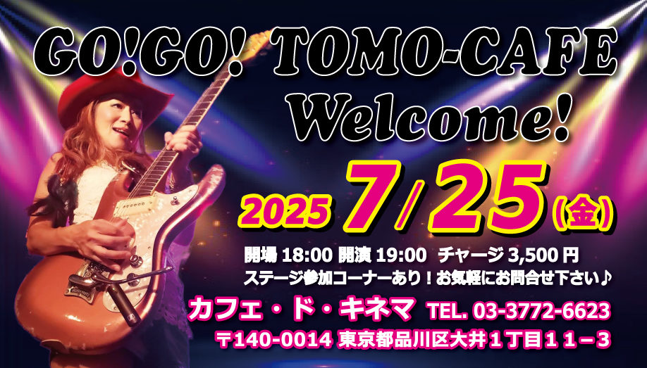 【品川】GO!GO!TOMO-CAFE Vol.7 7月 25 Fri 2025 LIVE 予約不要!お気軽にご参加下さい♬ 【日程】 2025年7月25日(金) 【時間】 開場18:00 / 開演19:00 【料金】 チャージ 3,500円(別途1ドリンク) ※ファンクラブ「TOMOの会」は500円割引 【出演】 TOMOKO(Gt&Vo) ステージ参加コーナーあり/ご予約の上、ご自分の楽器をお持ち下さい。 (機材使用料 1,000円) 【会場】 カフェ・ド・キネマ TEL. 03-3772-6623 〒140-0014 東京都品川区大井1丁目11−3 【お問合せ】 TET’S corporation TEL. 03-6869-8840(平日12~18時) FAX. 03-6893-3931 info@gogotomoko.com 前のスケジュール 次のスケジュール