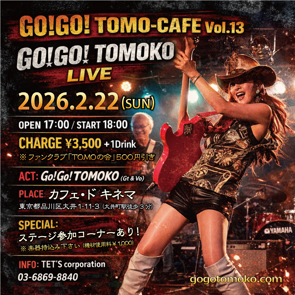 【品川】GO!GO!TOMO-CAFE Vol.13 2月 22 Sun 2026 LIVE 予約不要!お気軽にご参加下さい♬ 【日程】 2026年2月22日(日) 【時間】 開場17:00 / 開演18:00 【料金】 チャージ 3,500円(別途1ドリンク) ※ファンクラブ「TOMOの会」は500円割引 【出演】 TOMOKO(Gt&Vo) ステージ参加コーナーあり/ご予約の上、ご自分の楽器をお持ち下さい。 (機材使用料 1,000円) 【会場】 カフェ・ド・キネマ TEL. 03-3772-6623 〒140-0014 東京都品川区大井1丁目11−3 【お問合せ】 TET’S corporation TEL. 03-6869-8840(平日12~18時) FAX. 03-6893-3931 info@gogotomoko.com 前のスケジュール